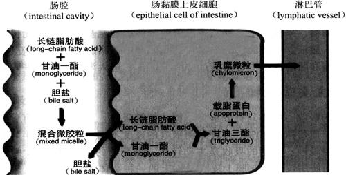 图9-58 小肠的皱襞、绒毛和微绒毛模式图 2.吸收的机制 各种营养物质通过肠黏膜上皮细胞或细胞间的紧密连接进入细胞间隙,而后再进入血液和淋巴液。吸收的机制概括起来包括被动转运(单纯扩散、易化扩散、渗透)、主动转运、入胞和出胞。 3.吸收的途径 营养物质通过两条途径吸收:一是血液,二是淋巴。糖类食物的分解产物葡萄糖、果糖、半乳糖,蛋白质的分解产物氨基酸,水、无机盐和水溶性维生素直接进入血液。脂肪的部分分解产物短链和中链脂肪酸也直接入血,但长链脂肪酸、甘油一酯和脂溶性维生素需通过胆盐的帮助先进入淋巴管,再进入血液。 (二)主要营养物质的吸收 1.糖类的吸收 糖类只有分解为单糖才能被吸收,主要的单糖有葡萄糖、半乳糖和果糖,其中葡萄糖占80%。各种单糖吸收的速度不同,葡萄糖和半乳糖最快,果糖次之,甘露糖最慢。单糖的吸收是主动转运。葡萄糖的吸收是与Na+的吸收偶联进行的,它们共同使用位于肠黏膜上皮纹状缘上的一种载体蛋白。 葡萄糖的吸收是逆浓度差进行的主动转运,其能量来自钠泵,属于继发性主动转运。小肠黏膜上皮细胞的侧膜上存在钠泵,小肠上皮刷状缘上有转运葡萄糖和Na+的转运体。由于钠泵的运转,造成细胞膜外即肠腔内Na+的高势能,当Na+与转运体结合顺浓度差进入细胞内时,释放的势能用于葡萄糖逆浓度差进入细胞。随着细胞内葡萄糖浓度的升高,上皮细胞基底膜上的载体将葡萄糖顺浓度差转运到细胞间液,而后被吸收入血。与此同时,进入细胞内的Na+,被细胞侧膜上的Na+泵转运到细胞外。可见,葡萄糖的吸收有赖于Na+的主动转运,二者同时进行,相互偶联,需要消耗能量。 2.蛋白质的吸收 蛋白质吸收的主要形式是氨基酸,它的吸收是主动的。目前在小肠壁上已确定有三种转运氨基酸的转运体,分别运载中性、酸性和碱性氨基酸。氨基酸的吸收也是与Na+的吸收偶联的,机制可能类似于葡萄糖的吸收。钠的主动转运被阻断后,氨基酸的转运便不能进行。小肠的刷状缘上还有转运二肽(dipeptide)和三肽(tripeptide)的转运体,二肽和三肽进入细胞后,被细胞内的肽酶分解成氨基酸,再进入血液。少量蛋白质可完整地进入血液,例如母亲初乳中的免疫球蛋白(抗体),可被婴儿完整地吸收,提高婴儿的免疫力。但是随着年龄的增加,完整蛋白质的吸收越来越少,不但没有营养意义,它们还可作为抗原而引起过敏或中毒反应,如有些人吃了某些食物(如鱼虾)后发生过敏反应。 3.脂肪的吸收 中链脂肪酸(middle-chain fatty acid)和短链脂肪酸(short-chain fattv acid)是水溶性的,可直接进入血液。长链脂肪酸(long-chain fatty acid)、甘油一酯(monoglyceride)和胆固醇(cholesterol)等都不溶于水,它们必须与胆盐结合形成水溶性复合物混合微胶粒(mixed micelle),才能透过小肠黏膜表面的非流动性水层到达微绒毛上。在这里,脂肪酸、甘油一酯和胆固醇从混合微胶粒中释放出来,通过脂质膜进入肠上皮细胞,胆盐则回到肠腔。进入细胞内的长链脂肪酸和甘油一酯重新合成为甘油三酯(triglyceride),并与细胞中的载脂蛋白(apoprotein)合成乳糜微粒(chylomicron),若干乳糜微粒包裹在一个囊泡内,以出胞方式进入淋巴(图9-59)。食物中的动、植物油含长链脂肪酸多,所以脂肪的吸收途径以淋巴为主。