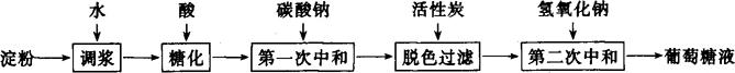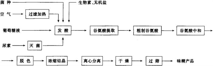 图1-13-33 淀粉水解成葡萄糖液工艺流程图 水解淀粉为葡萄糖有酸水解和酶水解,我国大型味精厂多用酸水解。酸水解的过程是:将淀粉与水充分混合,谓之调浆,使浓度成为10°Bé的淀粉浆。加入盐酸,催化淀粉水解,盐酸用量为干淀粉的0.6%左右,通常控制淀粉液pH1.5左右后水解,水解压力0.25~0.26MPa(表压),维持30min。当水解液用无水酒精试验,无白色浑浊时,将水解液进行冷却,冷却到70~80℃后进行第一次中和,用碳酸钠中和至pH4.8~5.0。然后加入活性炭脱色助滤,过滤后进行第二次中和,用氢氧化钠溶液中和至pH6.7~7.0,即得葡萄糖液。 2.2 谷氨酸发酵制造味精(图1-13-34)