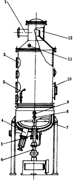图1-13-35 味精浓缩结晶罐 1-二次蒸汽排出管 2-汽液分离器 3-清洗孔 4-视镜 5-吸液孔 6-人孔 7-压力表孔 8-蒸汽进口管 9-锚式搅拌器 10-排料阀 11-轴封填料器 12-锚式搅拌器轴 该罐是一个带搅拌的夹套加热真空蒸发罐,可分为加热蒸发室、加热夹套、汽液分离器和搅拌器等四部分。其与物料接触部分均应采用不锈钢。 加热蒸发器为一圆筒形壳体,封底有半球形、碟形和锥形。器身上下圆筒部装有视镜和人孔。夹套的中上部装有进汽管,使蒸汽分布均匀。进口处加装挡板,防止蒸汽直冲而损坏内罐。冷凝水排除阀安装在最低位置,以防止冷凝水的积聚降低传热系数。 结晶罐上部顶盖多采用锥形,上接气液分离器,以分离二次蒸汽所带来的雾沫。一般采用锥形除泡帽与惯性分离器结合使用。分离出的雾液由小管回流入罐内。 搅拌装置的形式颇多,目前多采用锚式搅拌器。锚式桨叶与罐底形状相似,一般与罐底的间隙为2~5cm,转速通常是6~15r/min。搅拌轴采用下轴安装。 3.3 分离机 3.3.1 三足离心机 味精结晶后浓度为30~31°Bé,需脱水。中小型味精厂多用三足式离心机(参见第1篇第15章第2节)。使用三足式离心机结晶颗粒不易磨损,脱水效果好,特别它具有可控制分离时间来达到适应产品湿度变化的要求。 3.3.2 吊篮式离心机 吊篮式离心机按卸料方式不同有两种类型,一种是滤渣(晶体)借助人工用铲子或手动机械刮刀从转鼓底部卸出;另一种是依靠重力,在停车后自动从转鼓底部卸出。 吊篮式离心机优点:稳定并允许转鼓有一定程度的自由震动和摆动、卸渣快捷、晶体不易破碎。其缺点:主轴较长,易磨损,运转时有震动,卸料劳动强度大。 3.4 干燥器 用离心机分离后的味精,需进行干燥。味精在干燥器中温度不应超过70℃,晶体含水量低于0.2%。通常使用的干燥器有箱式干燥机(参见第1篇第6章第2节)、气流式干燥机(参见第1篇第15章第1节)、振动流化床干燥机(参见第1篇第14章第8节)。 |