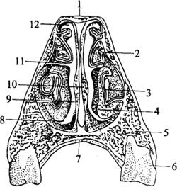 图1-9 马鼻腔的横断面(通过第三上臼齿) 1.鼻骨 2.上鼻甲 3.下鼻甲 4.鼻静脉丛 5.上颌骨 6.第三前臼齿 7.硬腭 8.下鼻道 9.总鼻道 10.鼻中隔 11.中鼻道 12.上鼻道 (2)喉 既是呼吸通道,也是发音器官。它以甲状软骨、环状软骨、杓状软骨和会厌软骨为支架构成(图1-10)。