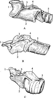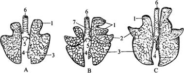 图1-11 家畜肺的分叶模式图 A.马 B.牛 C.猪 1.尖叶 2.心叶 3.膈叶 4.副叶 5.支气管 6.气管 7.右尖叶支气管