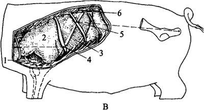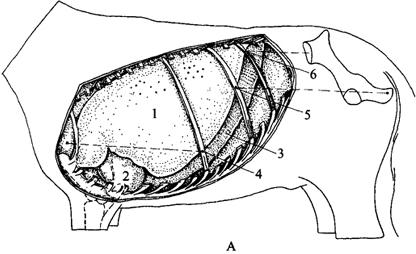 图1-12 肺的体表投影 A.马 1.肺 2.心脏 3.膈肌 4.肩关节与第10肋骨水平线的交点 5.坐骨结节与第14肋骨水平线的交点 6.髋结节与第16肋骨水平线的交点 B.猪 1.心脏 2.肺 3.膈肌 4.肩关节与第7肋骨水平线的交点 5.坐骨结节与第9肋骨水平线的交点 6.第11肋骨 家畜在安静状态下每分钟呼吸次数叫呼吸频率。几种家畜的呼吸频率为:牛10~30、山羊10~20、猪15~24。每次呼吸都进行着气体交换:吸入到肺内的氧气和血液中的二氧化碳交换;交换形成的含氧动脉血经血液循环送至组织;在组织内,血液中携带的氧释放给组织,同时组织产生的二氧化碳进入血液。 |