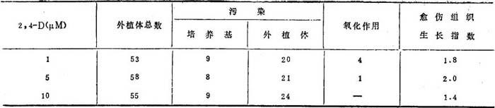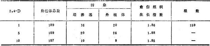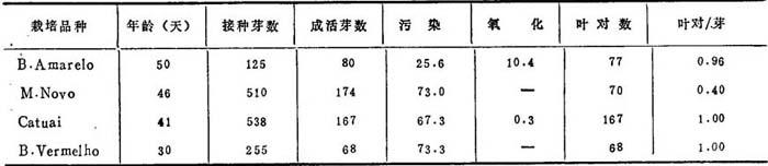 a.包括有胚性发生组织和胚的三角瓶。 采用培养成熟叶相同方法,改变2,4-D浓度,培养3月龄幼苗咖啡品种Mundo Novo的子叶。初次培养(条件性培养基)2月后资料例如表26-7。污染极少,最低量(1μM)也能诱导分化不定根。进一步培养,选用了5μM 2,4-D,与成熟叶培养相同。 表26-7 咖啡Mundo Novo子叶外植体愈伤组织诱导2