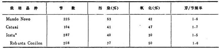 (2)主轴芽 供试植株取是10月龄温室,1-2年龄苗圃或15-20年龄大田。切取带有4-6节的绿色主轴芽。用1%去垢剂和无菌水洗后,用2.6%次氯酸钠表面消毒30min,连续振动(150rpm)。苗圃和大田生长植株放入湿室过夜,同法进行二次表面消毒。除去全部主轴芽的顶端分生组织。顶端分生组织下的最上端的节。编号一号。有可能时,这些芽着生叶对,切成原来大小的1/2和1/3。 初次培养基组成:改进的B5加吡哆醇15μM,烟酸30μM,肌醇550μM,半胱氨酸500μM,蔗糖2.5g/l,pvp-40 1g/l,和琼脂7g/l。培养瓶容积150ml,装25ml培养基。接种单节的培养瓶,用16.5μMpvp-40封口。这种膜的渗透性:CO2每24h10cm3/cm2,氧每24h 2cm3/cm2;氮每24h0.4cm3/cm2和水蒸气每24h10mg/cm2。 节培养保持在生长室中,光强400lx,光周期14h。824节外植体(取自大田生长的4个栽培品种)平均污染率43%,氧化率42%(表26-11)。 表26-11 初次培养30-60天后选择的大田生长咖啡植株的节培养物