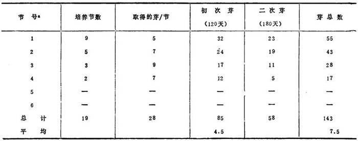 a.Catimor和Timor杂种节培养物结果相似 培养3周期间,可见节培养体中的休止主轴芽的发育。每节发育的芽1-6,受细胞分裂水平的部分控制。较高水平诱导效果较好,但对继续生长不利,生根频率降低。BA(25μM)比KIN更有效(芽/节2。1比1.2),50μM时为2.3∶1.4。 测验了GA对芽节间伸长的影响。在切取生根时,用25-50ppmGA直接处理发育中的芽有效。 当芽长到三节(培养后约60天)可切取备生根用。加IBA10μM的生根频率为60%。生根可用双层培养基,上层用基础培养基加IBA10μM,底层用加活性碳2.5g/l的基础培基。另一生根技术,用生长素处理未发育的芽10天,转入固体培养基,或滤纸桥上。用滑石制备的生长素处理的芽,在固体培养基上,生根频率高(60%)。 切取最初发育的芽后,将节外植体转入新鲜初次培养基,以使剩余的休止主轴芽发育。一个节外植体可生存2-3次转移,由此可使大部分休止芽发育。第三次转移(每二个月一次,6个月连续培养)可得9-10发育中的芽。从原始节培养体产生芽叫初次芽,由初次芽产生的叫二次芽。 按照上法6个月连续培养C.anabida cv.Mundo Novo一年生咖啡株节培养结果(表26-12)。培养最初60天,芽/节频率为1.33。第二次末(120天)累计数为4.5,第三次末(180天)累计数为7.5。 结果证明采用节培养技术,指出了休止主轴芽的营养繁殖潜力。可用于优良咖啡树的繁殖。第二次转移(120天)后,记录到19节取得85芽(85%)。理论估计繁殖率为: (1)最初生长期间(6个月),从具有6节的一个主轴枝节培养体产生了3节26芽。 (2)第二生长期间(3个月),3节104芽。 (3)第三生长期间(3个月),3节415芽。 总之,最后芽繁殖数,视每供试株取主轴枝数而定。应考虑污染和氧化和生根频率所造成的损失。 采用上述程序,取二个不育异种间杂种节培养。C.congensis×C.eugenioides主轴和侧枝节间切段的切面直接分化体细胞胚。是从皮层产生的,初次培养基上培养44天后,每切段平均产生8体细胞胚。并取得了直接胚胎发生。C.canephora×C.eugenioides节培养体,培养60天后,每节上叶对切端分化大量胚性发生组织。转入条件培养基,完成了体细胞胚发育。这些结果再次强调指出,在相同的生长培养基上,基因型的反应不同。 表26-12 Mundo Novo咖啡节培养的主轴芽发育