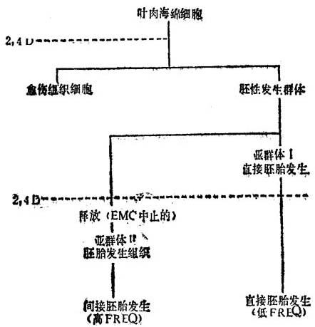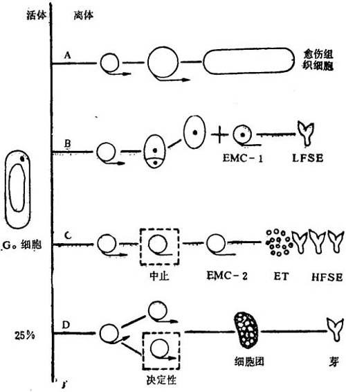 图26-1 咖啡叶外植体体细胞胚胎发生发育模式 A.在2,4-D和KIN存在下,海绵状叶肉细胞再进入细胞循环B.愈伤组织块中至少有二种细胞群体(长、高度液泡化的)和胚性细胞球形、细胞质浓C.直接胚胎发生模式的胚性细胞亚群体(低频率体细胞胚胎发生),仍在初次培养期间;转入二次培养基发生胚发芽D.二次培养体期间,除去2,4-D,容许第二种细胞亚群体的分化-胚性组织E.亚群体Ⅰ(低频率)和亚群体Ⅱ(高频率)产生的完全分化的体细胞胚。注意由于分化过程,这二类体细胞胚间有约1-2个月的时间差异 3.胚胎发生的调控机理 培养条件尤其是生长调节剂对培养组织不同细胞群体的有丝分裂活性的诱导有重要作用。依赖于细胞群体的特定调节状态,培养条件将能促进不同细胞循环时间和中止。体细胞胚能追溯到胚性母细胞(EMC),与二个发育顺序相关连:预胚性发生决定细胞(PEDC)和诱导胚性发生决定细胞(IEDC)。环境和培养逆境能有倾向性地影响不同细胞群体,容许调节变迁和循环中细胞的同步性(决定EMCs)。加强特定体系的EMC群体,可进行更深入分析(细胞学和生化水平的),将增高体细胞胚产量。可以期望标记DNA,将有可能密切控制在EMC决定期间和继后发育期间的细胞活动。在启动阶段期间,PEDC发育顺序应与IEDC的不同,为了了解体细胞胚胎发生的调控,比较研究这二种途径是有益的。 体细胞胚发育模式(图26-2)提出胚性母细胞(EMC)常与PEDC或IEDC相关连。再者,这种模式将能说明器官发生途径的起源,与正常胚性发生途径是有别的。器官发生于胚性组织形成早期,子细胞在细胞团块内保持相互接着,无极性。