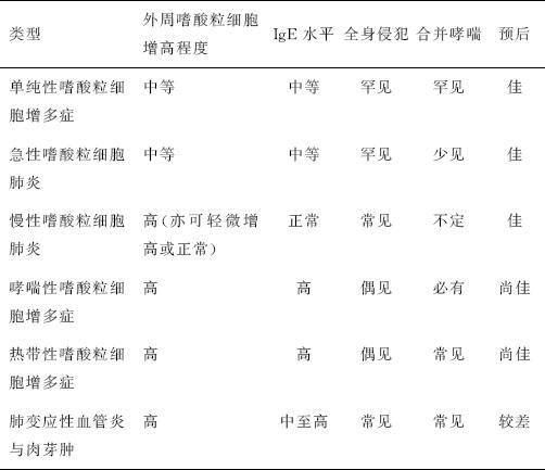 六、检查 1.胸部X线检查 是诊断和鉴别本组疾病类型的关键检查项目之一。 (1)单纯性嗜酸粒细胞增多症:表现为单侧或两肺周边可见边缘模糊、大小不等较淡的斑片状阴影,呈短暂游走性,多在1~2周内消失,而又可在其他部位出现,以下肺野分布多见。 (2)急性嗜酸粒细胞肺炎:胸部X线表现为肺野弥漫性薄雾状阴影;并可出现两侧或单侧少量胸腔积液,以双侧多见;也可出现慢性嗜酸粒细胞肺炎样的肺外周斑片状阴影。40%~50%的患者可见KerleyB线和A线,纵隔淋巴结肿大,但心影多正常。胸部CT检查表现为弥漫性毛玻璃状、片状或网状阴影、小叶间隔肥厚及胸腔积液,但小叶间隔肥厚在过敏性肺炎和急性间质性肺炎上往往不存在,这点有助于鉴别。 (3)慢性嗜酸粒细胞肺炎:呈非肺段性边缘不清的肺浸润影,多见于肺外周,以中上肺野之间、肺中外带多见,但肺门处透明,故呈“肺水肿反转形状影”。阴影呈非游走性,容易在原处复发。 (4)哮喘性嗜酸粒细胞增多症:胸部X线检查因病期不同可有不同表现,呈多样性改变。肺浸润影呈:①近端支气管扩张,有时可形成气液平面;②肺门周围浸润;③肺不张或阻塞性肺炎;④指套征,为支气管充填黏液而使其远端扩张所致;⑤牙膏征,呈带状(长约3cm,宽5~8mm),也为扩张的支气管腔内充满黏液所致,其与指套征均可在咳嗽、咳痰后消失;⑥轨道征,即两条平行细线(较同级支气管的宽度稍大)由肺门向外延伸(横断面呈环状),为支气管扩张征象。 (5)热带性嗜酸粒细胞增多症:可无异常阴影;典型者为弥漫性、分布较均匀、边界不清的小结节和斑点状模糊阴影,直径为2~5mm,亦可融合呈片状,多位于双侧中下肺野。 (6)肺变应性血管炎与肉芽肿:胸部X线检查可显示一过性及移行性浸润阴影,为斑片状或结节状,一般不形成空洞。30%左右的患者可出现胸腔积液。弥漫性肺间质浸润也有报道,但不出现空洞性病变。 2.肺组织活检 病变组织中的嗜酸粒细胞数约为外周血中的100多倍。开胸活检仍是诊断的“金标准”,但目前多用损伤较轻的经支气管肺活检(TBLB)来代替。 3.支气管肺泡灌洗 其安全且可以在病程的各个阶段多次重复进行,因此近来已受到了很大重视。其局限性在于仅能得到肺泡表面的细胞而不能获得间质中和血管周围的细胞,且有时难于区分细胞究竟是来自肺泡还是来自气道。患者的支气管肺泡灌洗液中常可发现嗜酸粒细胞比例增高(多高于5%,而正常人则低于1%),但有时在其他某些肺间质疾病、艾滋病并发肺孢子虫病以及药物引起的肺部疾病患者的肺泡灌洗液中也可发现嗜酸粒细胞增多。支气管肺泡灌洗液中增高的嗜酸粒细胞比例和肺活检结果有很高的相关性。 除上述3项检查外,为进一步做到分型诊断,尚需进行相关实验室检查。 4.血常规检查 本组疾病中外周血嗜酸粒细胞正常或轻度增高,但急性嗜酸粒细胞肺炎患者的末梢血中嗜酸粒细胞有明显二次增高特征。由于残留的抗原刺激,骨髓中原始的嗜酸粒细胞向末梢血释放,末梢血中的嗜酸粒细胞在病程的第5~10日左右第1次增高,约在病程的第20~30日出现第2次增高,这可能是骨髓本身嗜酸粒细胞产生增多的缘故。 5.便常规 若粪便中查到虫卵,对单纯性嗜酸粒细胞增多症的诊断有重要意义。 6.皮肤试验和血清检查 对哮喘性嗜酸粒细胞增多症有诊断意义。烟曲霉或曲菌提取液做皮内试验:即刻反应,90%的急性期患者在数分钟内即刻出现皮肤阳性风团和潮红;迟缓反应(arthus),部分患者在皮试4~8小时后发生皮肤红斑和硬结,24小时后消失;双向反应,部分患者可同时存在以上反应。血清检查示:①血清总IgE增高至正常值的2倍以上;②抗AF(烟曲霉)沉淀抗体阳性;③抗AF的特异IgE抗体和IgG抗体(IgE-AF和IgG-AF)增高,并至少2倍于AF皮肤试验阳性的哮喘患者血IgE-AF、IgG-AF水平。 7.丝虫补体结合实验对怀疑热带性嗜酸粒细胞增多症者有诊断意义。 8.活组织检查 包括肾、肺、皮肤、肌肉等受累活组织检查。显示小血管坏死性血管炎、血管周围肉芽肿形成和嗜酸粒细胞浸润,对肺变应性血管炎与肉芽肿者有诊断意义。 9.结合临床表现行肺功能、血气分析等检查,对临床治疗和预后指导有重要意义。 七、临床表现 1.单纯性嗜酸粒细胞增多症 可无症状,仅在胸部X线检查时偶被发现;或有轻微症状,如轻度非刺激性咳嗽、咳少量黏痰、低热(一般1周内自行恢复正常)、头痛、肌痛、胸痛、气短、厌食等,偶有患者咳出寄生虫成虫。临床体检亦可无任何体征,叩诊偶可闻及浊音,极少听到干、湿啰音。 2.急性嗜酸粒细胞肺炎(AEP) 好发于年轻者,30岁以下占多数,男性较女性多见。本病一般起病较急,表现为畏寒、发热、咳嗽、气急等;严重者表现为急性呼吸衰竭,两肺可闻及细湿啰音或高音调的爆裂音。症状可持续4~7日,但也有报道为2~23日,常有自愈倾向,或经肾上腺皮质激素治疗后逐渐缓解。 3.慢性嗜酸粒细胞肺炎(CEP) 呈亚急性或慢性病程;有高热或低热、呼吸困难、咳嗽(多呈刺激性)、体重减轻和盗汗,偶有咯血,也有症状轻微或无症状者;其特点是对激素有良好反应。查体可于双肺闻及干、湿啰音,可有淋巴结肿大、肝脾肿大。 4.哮喘性嗜酸粒细胞增多(ABPA)症 以发作性哮喘为突出症状,伴阵发性呛咳、厌食、乏力、消瘦、气短、大量盗汗(以晚间明显),早期有大量黏液性脓痰或泡沫痰,间歇性发热、咯血和局限性胸痛常同现。 Pat