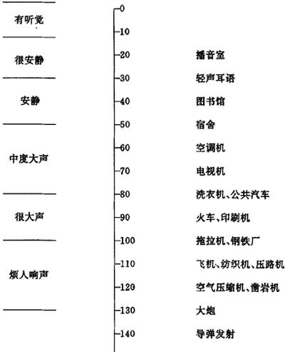 | 释义 | 噪声污染及其控制 1.噪声是什么 噪声是什么?它是声音的一种。从物理角度看,是由声源作无规则和非周期性振动产生的声音。从环境保护角度上看,噪声的范围要大一些,凡是人生活中不需要的声音,因为它使人觉得烦躁所以都叫噪声。在听音乐时,悦耳的歌声不是噪声,而在大街上,高音播放的音乐只能算是噪声。 噪声的强度用声级来表示,其单位是分贝(dB)。正常人的听觉所能感到的最小声级为1分贝,轻声耳语约为30分贝。会话语言(相距一米)约为60分贝。公共汽车中约为80分贝,重型载重车、织布车间、地铁内噪声约为100分贝,人耳阈(人耳痛的界限)为120分贝,大炮轰鸣、喷气机起飞约为130分贝(如图7.6.1-1)。