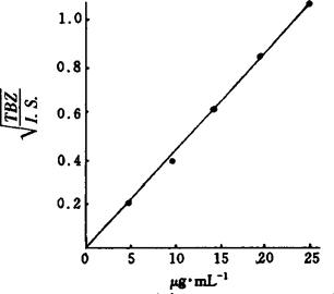 图10-4 噻苯咪唑的标准曲线 I.S.:内标物的峰高 TBZ:噻苯咪唑的峰高 |