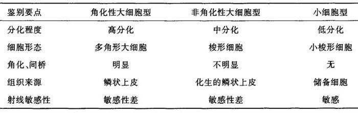 组织学上亦有三种类型:即角化性大细胞型、非角化性大细胞型、小细胞型(表7-5)。