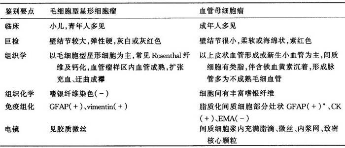 二者可以混淆的原因是:①二者均多见于小脑;②二者均有形成囊肿和壁结节的倾向;③毛细胞型星形细胞瘤的一些区常出现许多扩张的血管丛,酷似血管瘤,鉴别要点见表9-6。