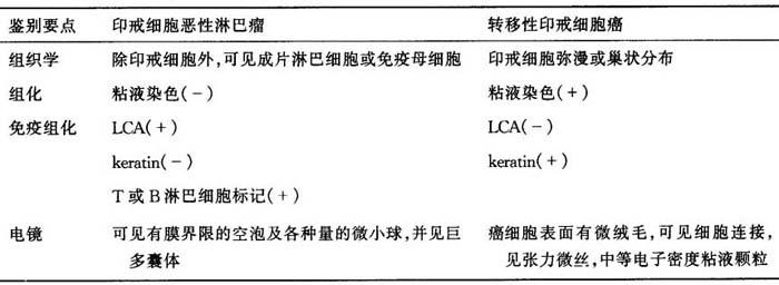 | 释义 | 四、淋巴造血组织的印戒细胞肿瘤 (一)印戒细胞恶性淋巴瘤 印戒细胞恶性淋巴瘤是非霍奇金淋巴瘤罕见的组织学类型。1978年Dorfman首次报告恶性淋巴瘤内出现伴印戒细胞的B细胞印戒细胞恶性淋巴瘤,主要是滤泡中心细胞及免疫母细胞型。其后陆续又报道了T细胞印戒细胞恶性淋巴瘤。前者比后者多见。这种类型恶性淋巴瘤均经免疫组化证实其B、T细胞来源。瘤细胞不含粘液,脂肪染色亦阴性。电镜见瘤细胞内单个大空泡及周围微囊,空泡为巨多囊体(giant multivesicular bodies),可能是粗面内质网(RER)或滑面内质网(SER),与空泡形成有关,胞浆内见各种量的微小体。因为淋巴结是癌最常转移的部位,故此型淋巴瘤发生在淋巴结内极易与转移性癌混淆,其鉴别见表2-4。 表2-4 印戒细胞恶性淋巴瘤与转移性印戒细胞癌的鉴别诊断