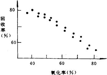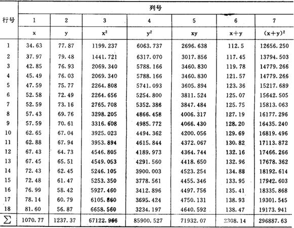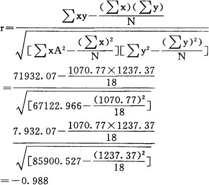 图1 回收率与氧化率的相关图 二、相关系数的计算和检验 1、相关系数的计算。 相关系数是两个变量之间相关关系密切程度的定量指标。为了从定量上看看回收率与氧化率相关的密切程度,应用表1中的列号1(∑x)、2(∑y)和从列号到1、2计算出来的列号3(∑x2)、4(∑y2)、5(∑xy)代入下列计算相关系数常用公式计算其相关系数。但此表中最后两列即列号6、7并不是必要的,那是为了核算计算结果是否正确而设计的。第6列∑(x+y)应等于第1列∑x加第2列∑y,第7列∑(x+y)2应等于第3列∑x2加第4列∑y2再加第5列2∑xy。将有关数据代入下式,得相关系数r为: