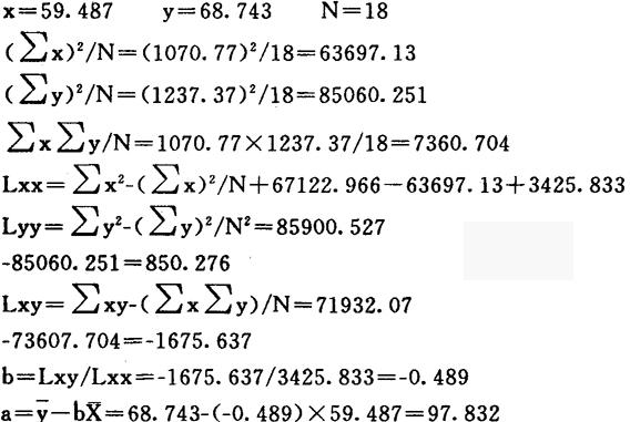 2、相关系数的检验。 根据计算出的相关系数,使之与相关系数检验表中的数值(称判定数)对比,来判定对应数据的相关关系。 查得.n2=16,a=0.01量为0.590,而|r|=0.988>r0.01=0.590,所以,分别有99%的把握判定y与x之间线性相关关系是较为明显的负相关。 三、一元线性回归方程的计算并利用它进行预测和控制 1、一元线性回归方程的计算。 铜矿石选矿回收率与铜矿石氧化率既然是较强的相关关系,而不是确定性关系,就只利用表1的有关数据通守回归分析找出两值得之间的近似直线关系y=a+bx。 由表1可知: