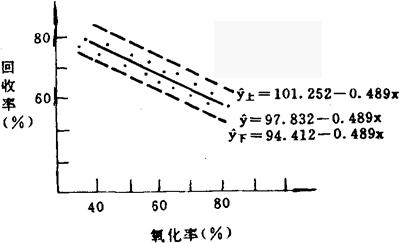 这就说明,用此回归预报的氧化铜矿石选矿回收率这一指标,还受到氧化率以外的其它因素的影响,有1.14的剩余标准离差。 3、利用回归方程进行预测和控制。 根据相关系数的检验所知,置信水平为99%。而当置信水产为99.7%时,因变量选矿回收率的散布点子落在以均值为中点的±3s范围内的概率为99.7%,即以回归线为基准分别向上3s向下3s画两条平行于回归线的直线,如图2所示,就可确定为预测和控制线。 下界限控制线为 上界限控制线为