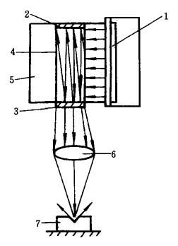 图2-8 固体激光器结构原理 1—光泵(激励脉冲氙灯);2—全反射镜;3—半反射镜;4—激光器工作物质;5—聚光器;6—聚焦透镜;7—工件 |