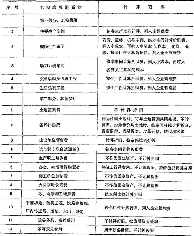 注:固定资产中的备用项目、备用设备等只计算原则上的动用者,不动者不计算。 (二)固定资产年平均折旧率 (1)机器设备年平均折旧率为原值的5-6%。 (2)辅助性设备年平均折旧率为原值的5-6%。 (3)厂房、构筑物年平均折旧率为原值的5%。 (4)机动车辆年平均折旧率为原值的10%。 (5)上述1-4项目的大修理折旧,为原值的2%。 |