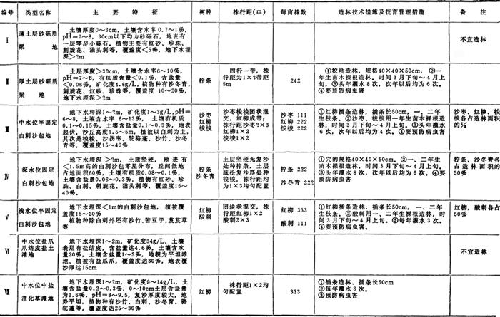 表4-2-11 立地条件类型及其主要特征和固沙树种选择表