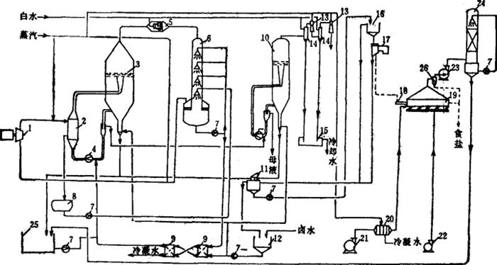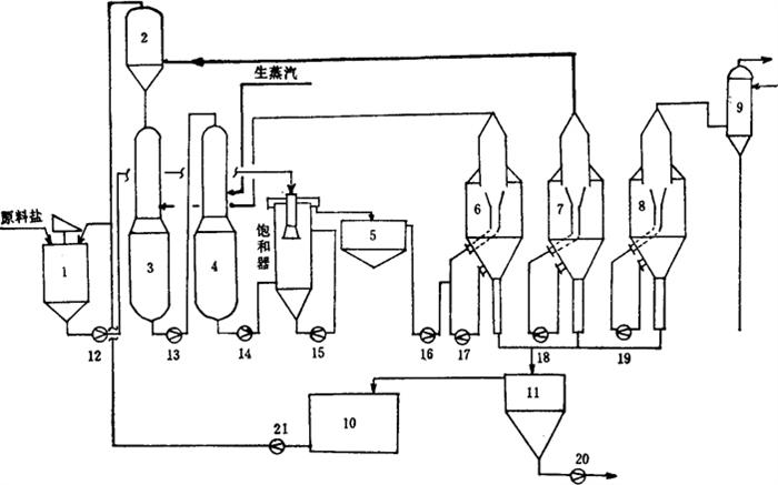 图3-4-21 闪蒸再结晶制盐工艺流程 1-配浆桶 2-一级加热器 3-二级加热器 4-三级加热器 5-沉清桶 6-一级闪蒸器 7-二级闪蒸器 8-三级闪蒸器 9-混合冷凝器 10-母液桶 11-盐浆桶 12、13、14、15、16、20、 21-泵 17、18、19-循环泵 2.流程特点 (1)用固体原盐浆料,颗粒直径≤2.5mm, (2)三效闪蒸罐蒸发,三级加热罐加热卤水,在高温(≥100℃)工况溶盐制卤。卤水中CaSO4溶存量少,可保证盐质。 (3)用Ⅰ、Ⅱ效闪蒸罐二次蒸汽直接接触加热物料,换热器无传热面,可不发生换热面结垢问题。 (4)蒸发汽、冷凝水形成封闭系统 (5)系统工作循环温度低,最高≤110℃。 3.流程适用范围 (1)本流程适用于含多种杂质的固体原盐(海盐或湖盐)的重结晶精制,生产精制盐。 (2)原盐中可溶性成分在蒸发制盐过程中会不断富集,需要抽排母液。 (3)本流程适于中小规模的盐厂。 4.主要技术经济指标 (1)盐质:NaCl含量≥99.3%。 (2)汽耗:0.9t蒸汽/t盐 |