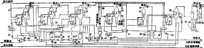 图3-4-20 硫酸钠型卤水“母液回收法”脱硝制盐流程图 1、6、11、16、26-加热室 2、7、12、17、22、27-循环泵 3、8、13、18、28-蒸发罐 4、9、14、19、24-除沫器 5-蒸汽喷射压缩泵 10、43、44、45、46、56-冷凝水桶 15、35、48、49、50、51、52、53、54、55-泵 20-蒸喷压缩泵 21-母液中转桶 23-闪发罐 25-盐浆桶 29-硝浆桶 30-混合冷凝器 31、33-蒸喷泵32-冷凝器 34-热水流 36、37、38、39、40、41、42-预热器 47-母液贮桶 2.流程特点 (1)四效蒸发制盐,一个效蒸发制硝、制盐,第四效与制硝蒸发罐构成母液循环高温罐析硝,低温罐析盐,效间设置闪蒸罐回收热能,降低效间循环料液温度梯度。 (2)制盐首效与制硝蒸发罐均设蒸汽除沫器、蒸汽喷射压缩器,部分二次蒸汽增压后利用,提高热能利用率。 (3)卤水需经除钙镁处理。 3.流程适用范围 进罐卤水要求:Na2SO4含量20~25g/L,Ca2+≤20ppm,Mg2+≤10ppm;否则运行中结垢,蒸发热平衡恶化,无水芒硝质量不能保证。 4.主要技术经济指标 (1)盐质:NaCl含量≥99.3% (2)无水硫酸钠质量:Na2SO4≥99% (3)卤耗:4.4t/t盐 (4)副产无水硫酸钠:75kg/t盐 (5)汽耗(含无水硫酸钠):1.05t/t (6)电耗:22kW·h/t (三)闪蒸再结晶制盐工艺流程 1.工艺流程图例 见图3-4-21