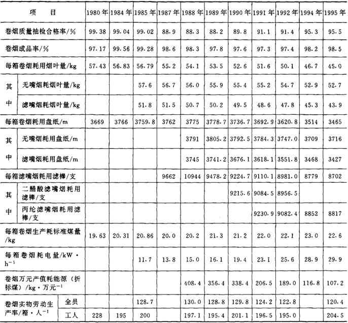 | 释义 | 国内外卷烟企业的主要经济技术指标统计数据 (一)我国卷烟工业企业主要经济技术指标 见表2-5-1,表2-5-2,表2-5-3和表2-5-4。 表2-5-1 1980~1995年(1986年和1993年除外)我国卷烟企业主要经济技术指标
