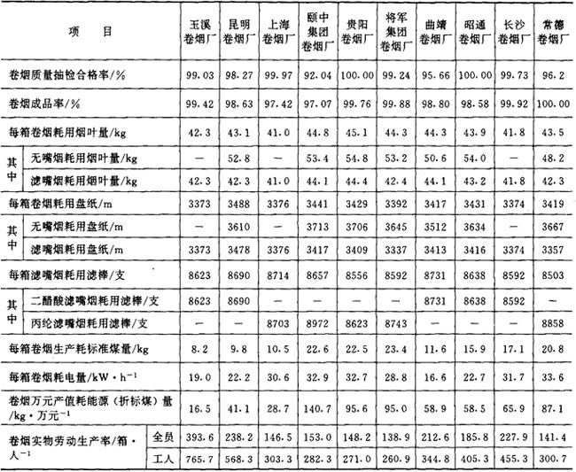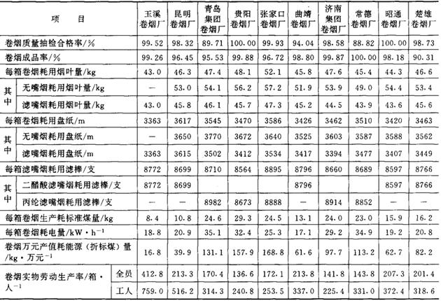 注:*为修正过的数据。 2.劳动生产率 卷烟企业的劳动生产率在不断提高。 例如:(1)美国R.J.雷诺士烟草公司的Tobaccoville卷烟厂,其劳动生产率为1000箱/(人·年)以上; (2)美国菲利浦·莫里斯公司的Cabarrus卷烟厂,劳动生产率为1016箱/(人·年);在1994年完成人员裁减后,其劳动生产率为1328箱/(人·年); (3)日本烟草公司的北关东卷烟厂,其劳动生产率约为1500箱/(人·年)。 |