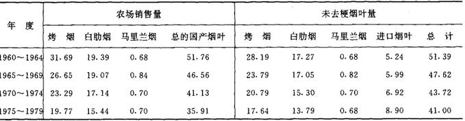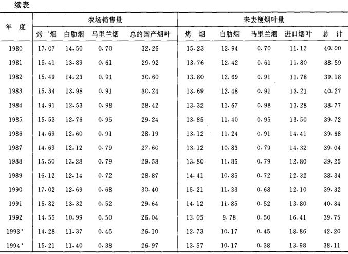 (二)世界部分国家(或企业)的技术经济指标 1.卷烟单箱烟叶消耗 20世纪90年代初,德国、奥地利等国标准的84mm滤嘴卷烟的单箱耗丝量平均为37.5kg/箱左右,乐富门(Rothmans)推出的Craven A牌低重量卷烟,其单箱耗丝量为33.75kg/箱。 美国的平均卷烟单箱耗烟叶量80年代一直保持在38~40kg/箱左右,见表2-5-5。 表2-5-5 1960~1994年美国生产卷烟中所消耗的各类型烟叶量 单位:kg/箱(5000支)