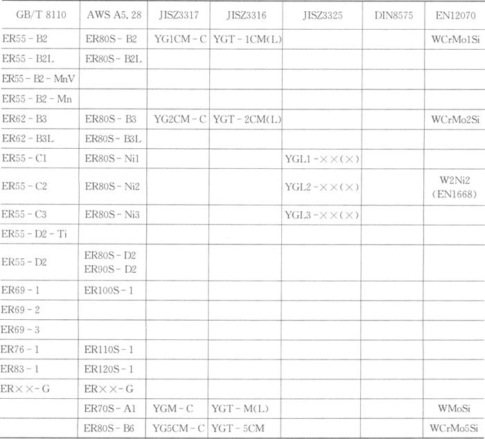 表2.3-10 国内外低合金钢气体保护焊焊丝牌号对照表