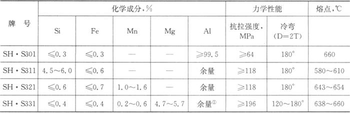 1.上海电焊条有限公司上海电焊条有限公司所属上海斯米克焊材有限公司推出四种牌号的铝及铝合金焊丝,它们是:SH·S301(铝焊丝)、SH·S311(铝硅合金焊丝)、SH·S321(铝锰合金焊丝)和SH·S331(铝镁合金焊丝),相当于国家标准型号SAl-1、SAlSi-1、SAlMn和SAlMg-5。