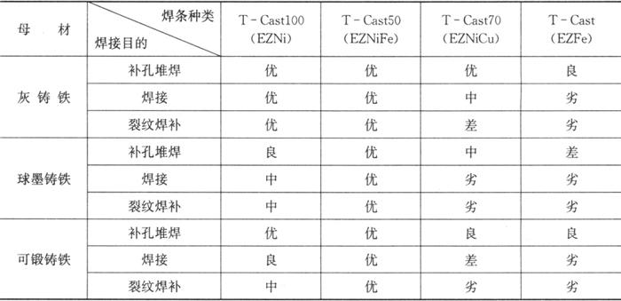 注:以上焊条均可交直流焊接,但CHC116宜采用直流反接焊。 2.天泰焊材(昆山)有限公司 对于天泰焊材(昆山)有限公司生产的用于铸铁焊接的材料,可根据表6.6-2选择。 表6.6-2 根据铸铁母材和焊接目的对电焊条的选择