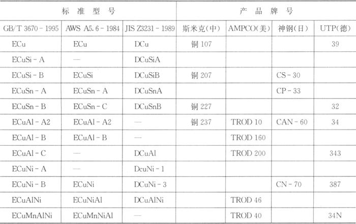 | 释义 | 国内外铜及铜合金焊条对照 我国GB/T 3670-1995标准的修订,主要参考采用了美国标准ANSI/AWS5.6-84和日本工业标准JIS23231-1989。国内外主要铜及铜合金焊条标准型号和产品牌号对照表见表8.2-3。 表8.2-3 铜及铜合金焊条型号和牌号对照表