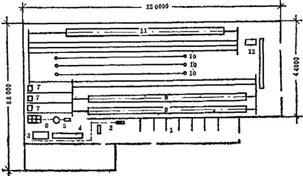 1-70.4m烧煤隧道窑;2-窑车(2000×1020×420mm);3-移动式冷风机;4-标准门:5-手动托车6-单筒卷扬机;7-出口门;8-冷风机;9-热风机;10-回车卷扬机:11-进口门:12-油压顶车机