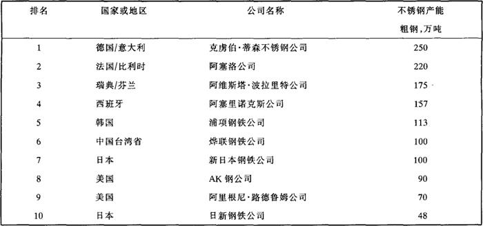 | 释义 | 国外企业编 不锈钢自20世纪诞生以来,五六十年代在欧美开始大量生产和应用;随着新工艺、新装备的不断采用,70年代日本大规模生产,成本大幅度下降,不锈钢应用更加普遍;80年代,韩国、中国台湾省以及南非等国家和地区大力发展不锈钢产业;90年代不锈钢的生产、消费全球化过程加快。总之,随着人们生活质量的提高和各工业部门需求量的不断扩大,伴以生产工艺、技术、装备的创新以及生产专业化,规模经济效益化,从而有力地推动了不锈钢的迅速发展和应用普及。 截止1997年,工业发达国家和地区(包括韩国、中国台湾省)不锈钢粗钢产量已突破1600万吨,1998年粗钢产量有所下降,较1997年减少1.2%,但仍接近1600万吨。如果加上俄罗斯、东欧、中国的产量,全世界不锈钢产量约为1800万吨,是1950年的18倍,不锈钢占总钢产量的比例达2.3%,年增长速度大约是5%~8%。在1988~1998年期间,全世界不锈钢生产年均增长率为4.89%。期间,韩国增长最快,达到35.93%,依次为中国台湾省、印度和南非,增长率分别为25.11%、18.48%和12.6%。2001年,世界主要国家和地区的不锈钢产量达1900万吨,21世纪,预期全世界不锈钢产量将会超过2000万吨。目前世界不锈钢的产能大致是2300万吨。 近几年来,不锈钢生产的集中程度越来越高。截止1998年,发达国家日本、美国、德国、法国、意大利、西班牙、韩国,再加上俄罗斯,年产不锈钢粗钢产量超过100万吨的国家达到8个。随着市场需求的扩大,新的生产企业不断建立,产品的竞争日趋激烈。为了降低生产成本、扩大市场份额,通过扩大生产规模和引入新的生产工艺和装备增加生产能力,提高效率。在全球钢铁企业合并重组浪潮的冲击下,不锈钢行业也先后出现了诸如克虏伯·蒂森不锈钢公司、阿塞洛公司、阿维斯塔·波拉里特公司、阿塞里诺克斯公司等新组建的世界级跨国不锈钢公司,加上韩国浦项钢铁公司,这五家企业不锈钢的产能占世界产能的60%。粗略统计,目前世界不锈钢生产厂家大约有300多家,排名前10位的企业(见表1)的产量占世界需求量的80%。而且,受市场竞争的驱使不锈钢企业生产规模将继续扩大,到2006年前四家的产能都将接近300万吨左右,浦项钢铁公司的产能达到160万吨。 表1 排行前10名的厂家