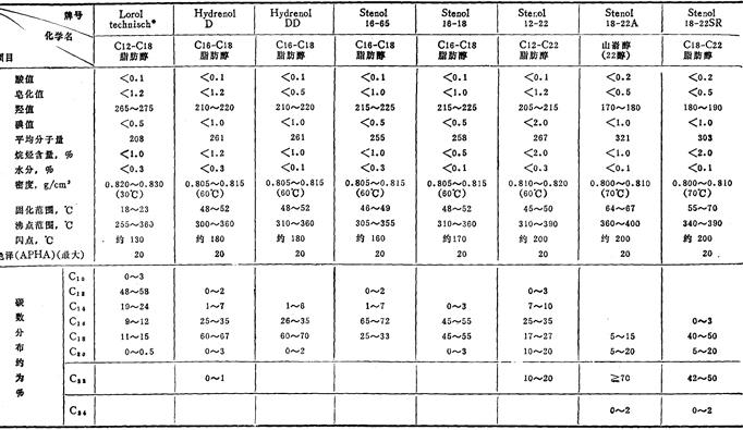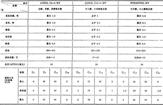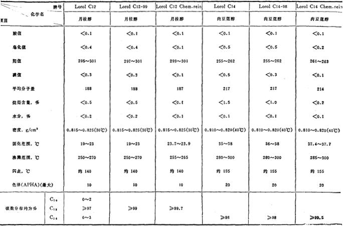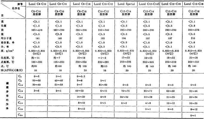 | 释义 | 国外脂肪醇质量简介 国外生产公司(厂) 德国汉高公司,美国P&G公司、Shell公司、大陆油品公司,日本三菱油化公司、日产化学公司等。 国外质量规格参考(同上各公司) 德国汉高公司脂肪醇(天然脂肪醇) (一)饱和脂肪醇 蒸馏级脂肪醇(天然饱和醇)(1)