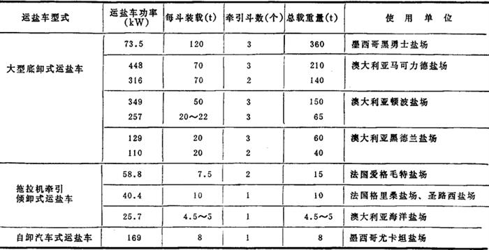 | 释义 | 国外运盐车 有三种型式:大型底卸式、拖拉机牵引倾卸式和自卸汽车式,性能见表2-8-23。 表2-8-23 国外运盐车性能表