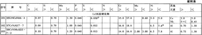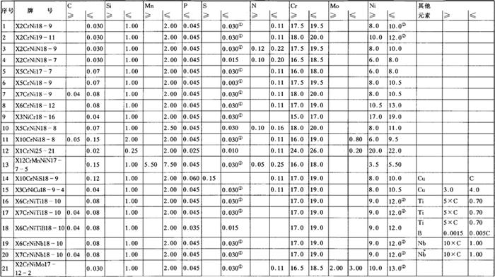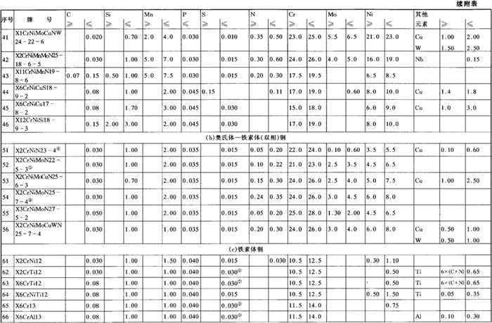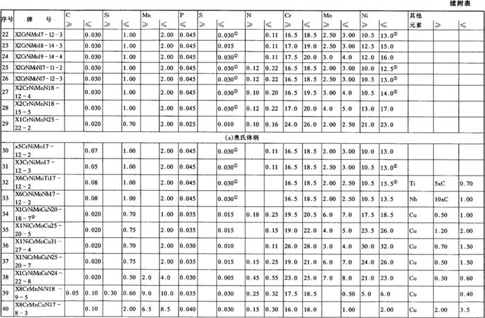 注:①熔炼分析,%(m/m),IsO/PDTs15510:2002。 ②可提供特定的硫含量范围以改善特定的性能:为改善切削加工性,建议硫含量控制范围为0.015%~0.030%;为改善焊接性,控制范围为0.008%~0.020%,为改善抛光性,控制最大0.015%。 ③当有特殊原因(如热加工或低磁导率)需要减少铁素体含量时,最大Ni含量可按下列数量增加:序号1和32为0.50%;序号2、16、17、19、20、25、26、27和31为1.00%:序号21、22为1.50%。 ④Cu可增加到1.00%。 ⑤取得专利的牌号。 ⑥对于特殊用途,N、Cr和Mo的较低下限可为0.14%、22.0%和3.0%。 ⑦当切削性特别重要时,S可增加至0.045%。 ⑧对于某些用途,如可焊性或高强度钢丝,C最大可为0.12%。 ⑨当钢材用于冷变形加工时,经同意Ni可按7.00%~8.30%订货。 |