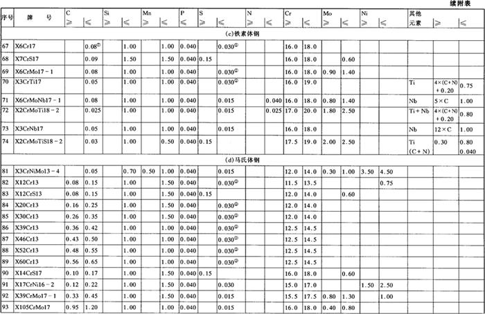 | 释义 | 国际标准化组织(ISO)不锈钢标准牌号及化学成分(熔炼分析)①