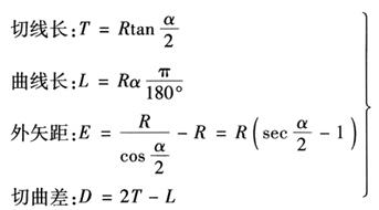 如图11-1所示,已知路线中线交点(JD)的偏角为α和圆曲线的半径为R,要计算的圆曲线的元素有:切线长T、曲线长L、外矢距E和切线长度与曲线长度之差(切曲差)D。各元素可以按照下式计算。