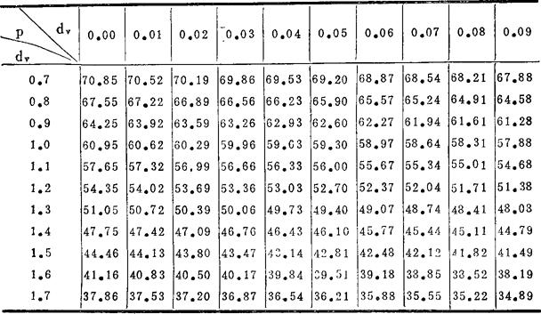 (2)在一定地区内研究土壤物理性状,需经常测定土壤总孔隙度时,可假定土壤比重为一常数,直接测定土壤容重,按照一定的经验公式,计算出土壤的总孔隙度。例如某一地区得到有如下的经验公式: 土壤总孔隙度(%)=93.947-32.995dv 在工作中为了方便起见,还可按此式计算出常用容重范围的土壤总孔隙度查对表,这样一经测定出容重,即可查表4-5迅速得出土壤总孔隙度。 表4-5 土壤容重(dv)与土壤总孔隙度(p)查对表