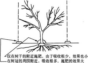 | 释义 | 土壤施肥(根际施肥) 根部施肥必须掌握根系的生长、分布、吸收特性,才能将肥料施到最适宜的吸收部位,充分发挥肥料的最大效能。 (一)施肥部位 一般果树水平根的分布要比树冠扩展范围广而远,往往超过树冠直径的1~2倍;垂直根多在100厘米范围内。吸收水分和养分的细根,水平方向多分布在树冠稍远处,垂直方向多密集于20~40厘米之间。所以将肥料均匀地施在根系密集层为最理想(图5-9、图5-10)。由于根系具有趋肥性,生长方向常以施肥部位而转移,因此,将肥料施在比根系集中分布的位置略深稍远些,可诱导根系向纵深发展,扩大吸收面积,以增强树体的抗逆性。施肥深度和广度随树种、品种、树龄、环境条件、栽培技术和肥料种类等而变化。幼树根系浅,分布范围小,以浅施为宜。树龄大,根系扩展范围广,扎得深,应扩大施肥范围和深度。