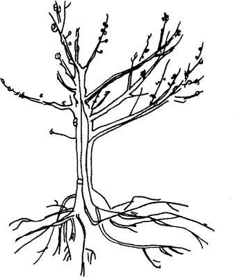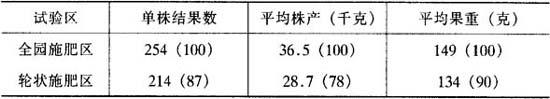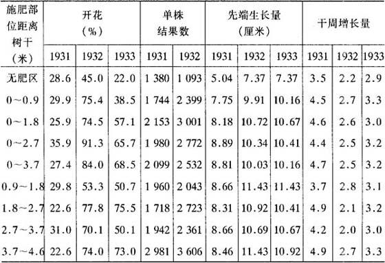 图5-10 桃树养分、水分上升的路径 据对25年生的苹果树进行施肥部位试验,除无肥区外,在树干附近(0~0.914米和0~1.829米)施肥的树体表现最差,叶色浅,落叶早。而在树冠外缘或稍外缘的效果最好(表5-35)。 表5-35 施肥部位对果树生长和结果的影响 (Marth,1935)
