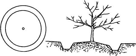 图5-11 环状施肥 (2)放射状沟施肥 是在树冠下,距主干1米以外处,顺水平根生长方向放射状挖5~8条施肥沟,宽30~50厘米,深20~40厘米,将肥施入。为减少大根被切断,应内浅外深。可隔年或隔次更换位置,并逐年扩大施肥面积,以扩大根系吸收范围(图5-12)。