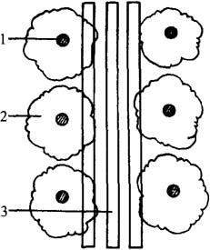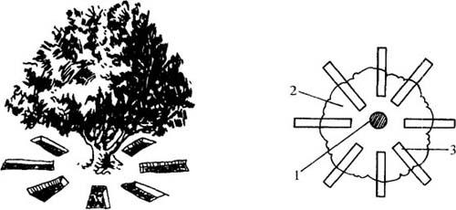 图5-12 放射沟施肥 1.树干 2.树冠投影 3.放射状沟 (3)条沟施肥 即在果树行间,树冠滴水线内外,挖宽20~30厘米,深30厘米的条状沟,将肥施入,也可结合深翻进行。每年更换位置。此法适宜于宽行密株栽植的果园采用,较便于机械化(图5-13)。
