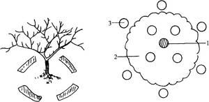 图5-13 条状沟施肥 1.树干 2.树冠 3.条状沟 (4)穴状施肥 即在树冠外围滴水线外,每隔50厘米左右环状挖穴3~5个,直径30厘米左右,深20~30厘米。此法多用于追肥,如施液态氮、磷、钾肥或人粪尿、沼气肥液等,以减少与土壤接触面,免于土壤固定(图5-14)。