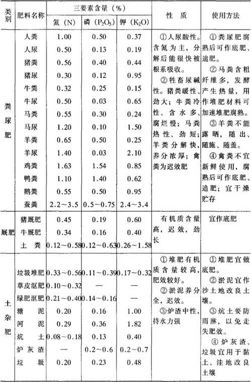 图5-14 穴施法 1.树干 2树冠投影 3.施肥穴 (5)全园施肥 即在果园树冠已交接,根系已布满全园时,先将肥料撒于地面,再翻入土中,深约30厘米左右。但因施肥浅,常诱发根系上浮,降低根系抗逆性。若与其它施肥法交替施用,可互补不足,充分发挥肥效。 (6)灌溉式施肥 即将溶解度大的肥料溶于水中,与喷灌、滴灌相结合施入土中。实践证明,任何形式的灌溉施肥,由于施肥均匀,根系吸收面积大,既不伤根,又保护耕作层土壤结构,节省劳力,供肥及时,肥料利用率高,增产效果明显。灌溉式施肥,对树冠相接的成年树和密植果园更为适合。 (三)果树根部常用肥料种类与特性 肥料的性质不同,施入土壤后的转化各异,对果树年周期中各生育阶段的营养作用及其后效也各不相同。因此,了解和掌握各种肥料的特性,对平衡树体养分,提高肥效是至关重要的。 1.有机肥料 有机肥料种类很多,主要有人畜尿、厩肥、堆肥、绿肥、饼肥、泥土肥、糟渣肥、腐肥、生活垃圾、污泥等。有机肥是一种完全肥料,它含有丰富的有机质和作物所需的多种营养元素,施用有机肥料是农业生产中能量和物质循环不可缺少的环节,也是生产无公害果品的重要措施之一。有机肥料除具有营养作用、增加果树产量、改善果品质量外,在改良土壤和培肥地力方面具有独特的效果。 由于有机肥料施入土壤后需经微生物分解重新合成腐殖质,并释放无机态养分供果树根系吸收,因此肥效迟缓而持久,适合做基肥施用。 有机肥与速效性化肥混合施用可增进肥效,缓急相济,互补长短,充分发挥各自的增产潜力和养地效果。 各种有机肥料的具体成分、性质与施用方法见表5-37。 表5-37 农家肥的肥分、性质与施用