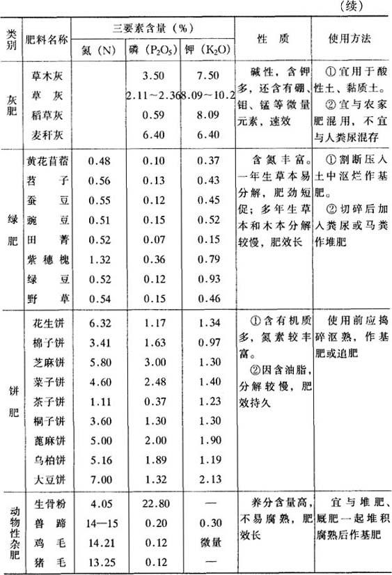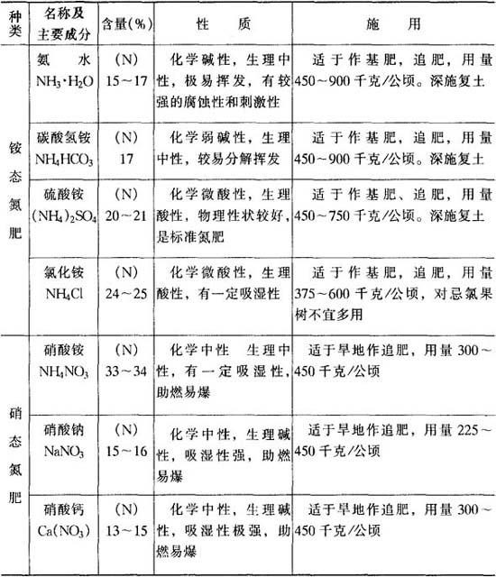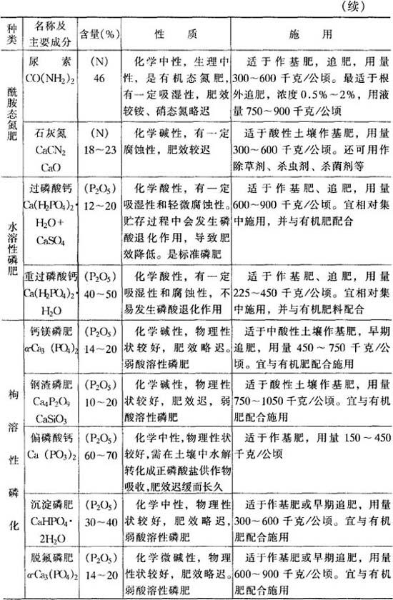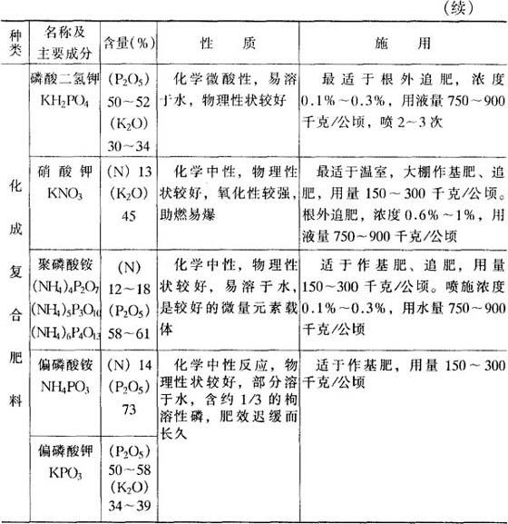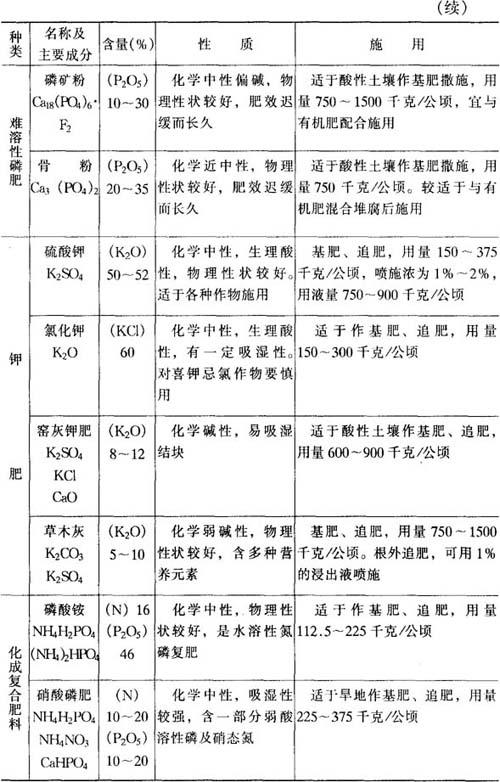 2.化学肥料 根据肥料中养分种类与形态,可分成化学氮肥、磷肥、钾肥,钙、镁、硫肥,微量元素肥料和复混肥料几大类。化肥具有养分含量高、肥效快、易被根系吸收等特点,但易挥发、流失、淋洗、固定,利用率低,易污染环境。因此化肥易做追肥土施或叶面喷施,肥效显着。果树根部施肥常用的化肥种类、性质及施用技术等列表5-38,供施用时参考。 表5-38 化学肥料成分、性质与施用