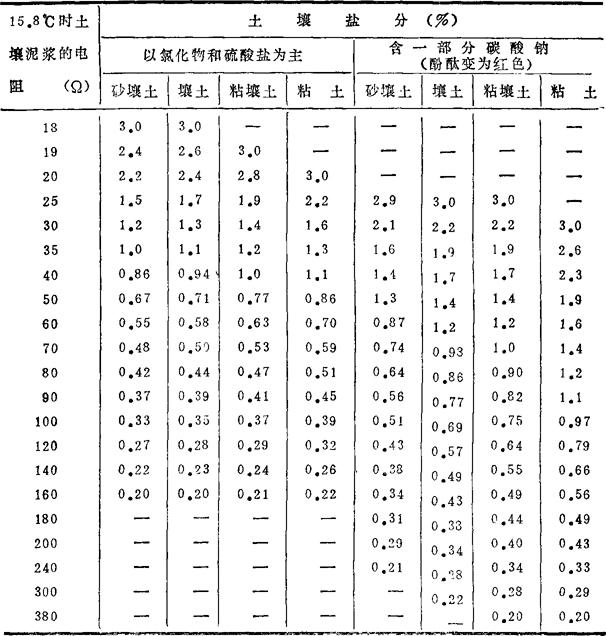 | 释义 | 土壤泥浆电导法 (一)适用范围 除了盐分低而代换性钠又较多的土壤以外,土壤泥浆法可以得到土壤含盐量的较好的半定量近似值。此法简便而快速,但不同土壤其含盐量可能相同,但其电阻则可能有相当大的变化,故在用电阻换算为不同质地土壤中的含盐量近似值时,必须注意不同土壤盐分组成的差异(表14-4)。 表14-4 在标准土壤杯中,土壤泥浆的电阻换算为不同质地的土壤中含盐量的近似值(1)