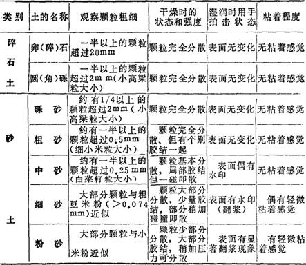 注:1.土的级别为相当于一般16级土石分类级别。 2.坚实系数f为相当于普氏岩石强度系数。 (二)土的野外鉴别方法 1.碎石土、砂土野外鉴别方法(表17-87) 表17-87 碎石土、砂土野外鉴别方法