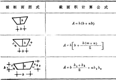 注:①a为方格网的边长(m);b,c为零点到一角的边长(m);h1、h2、h3,h4为方格网四角点的施工高程(m),用绝对值代入;∑h为填方或挖方施工高程的总和(m),用绝对值代入;V为挖方或填方体积(m3)。 ②本表公式是按各计算图形底面积乘以平均施工高程而得出的。 2.常用横截面法计算公式(表17-96) 表17-96 横截面法计算公式