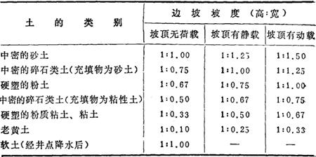 (3)当地质条件良好,土质均匀且地下水位低于基坑(槽)或管沟底面标高时,挖方深度在5m以内不加支撑的边坡最陡坡度应符合表17-99的规定。 表17-99 深在5m以内的基槽(坑)、管沟边坡的最陡坡度(不加支撑)